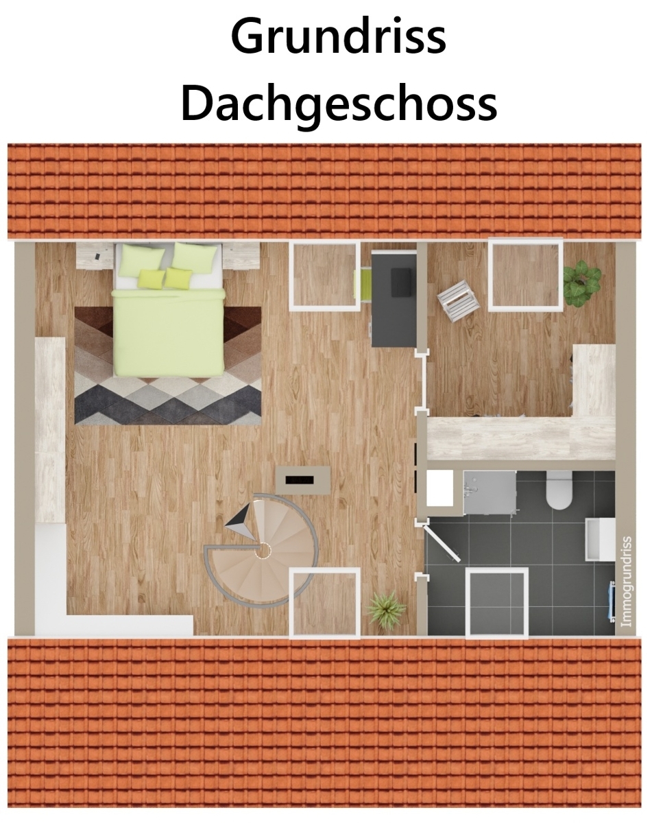 Obere Ebene: Im Dachgeschoss, über eine interne Treppe erreichbar, finden sich: