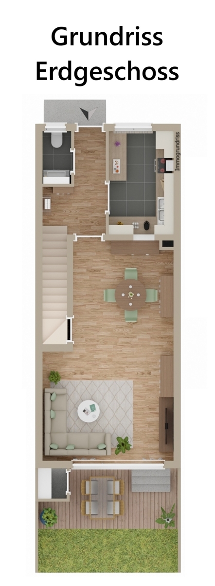 Beim Betreten des Hauses empfängt Sie eine einladende Diele. Rechts das praktische Gäste-WC, links die Küche mit Durchreiche zum Wohn- und Essbereich. Das großzügige Wohnzimmer öffnet sich zur sonnigen Terrasse mit Garten – perfekt für entspannte Stunden im Freien. Ein Abstellraum auf der Terrasse bietet zusätzlichen Staufläche.