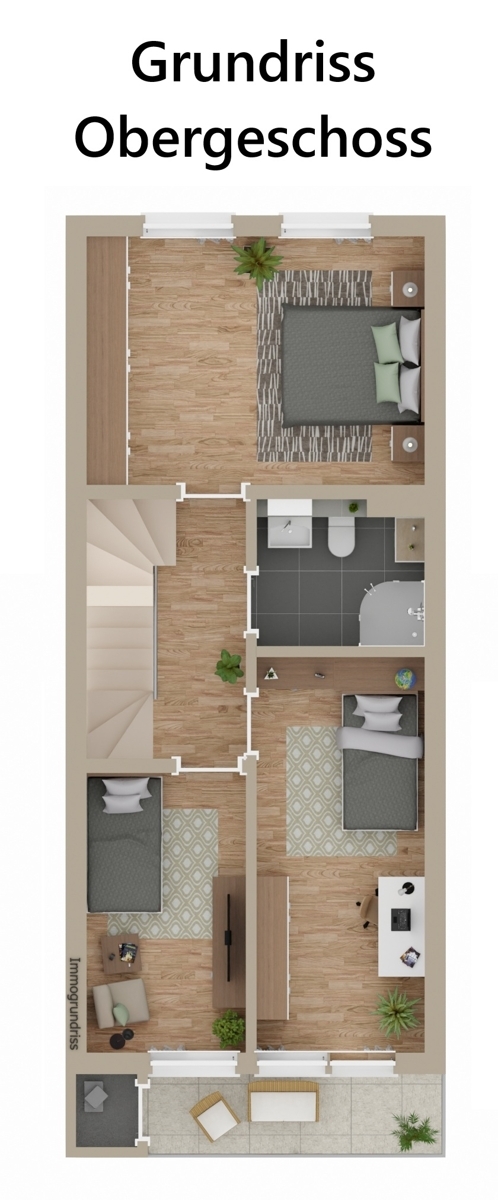 - Obergeschoss: 3 Schlafzimmer, Badezimmer mit Eckdusche, Balkon mit kleinem Abstellraum